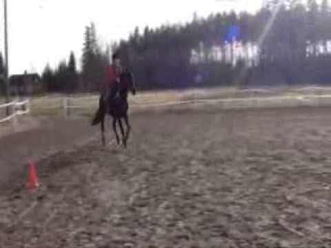 Tänään pääsin pitkästä aikaa Diivulin kanssa hyppäämään! Videolta tehtävät näkyvätkin melkein kokanaisuudessaan, iso kiitos Inkalle videoinnista alkutunnista, lopputunnista nyt ei valitettavasti videota olekkaan kun Inkan piti itselleen mennä poni laittamaan kuntoon :) Tunnilla hiottiin lähinnä teknikkaa alussa pienillä korkeuksilla sekä yksinkertaisilla hyvillä tehtävillä. Toisella pitkällä sivulla oli linja ja aika keskellä kenttää oli loivan kiemurauran tapaan kavaletti sekä puomilähestymisellä pysty. Verkassa asettelin ja taivuttelin kunnolla sekä ulos,että-sisälle päin ja pyrkimyksenä oli,että hevonen alkaisi liikkua mahdollisimman rentona. Toisella pitkällä sivulla oli töttöröt joiden väleistä tehtiin siksakkiin pohkeenväistöä ja myöhemmin tultiin niitä laukassa laukkavaihdoilla. Eniten ehkä mokailuja tuli alkuun tuolla kavaletti-pysty tehtävällä, lähdin kääntämään monesti liian aikaisin ja pariin otteeseen jälkimmäiselle ei oikein täsmännyt. Kumminkin kun jälkimmäistä estettä koko ajan korotettiin tuntui,että itsekkin oli jotenkin skarpimpana ja keskittyi paremmin, lopussa tehtävä rullasikin ihan kivasti. Lopussa tultiin pitkän sivun linjaa muutaman kerran peräjälkeen, viimeinen okseri oli korkeimmillaan reilu 100cm, saatiin vikalla kerralla tosi hyvät hypyt johon oli hyvä lopettaa , diivuli hyppeli hienosti ja oli tosi kiva taas pitkäsä aikaa tamman kanssa päästä hyppäämään.