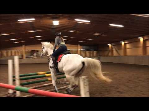 Toissa viikolla lauantaina meillä oli toisella pitkällä sivulla okseri-pysty-okseri neljän askeleen linja sekä kavaletilta-pysty-kaveltti viiden askeleen linja. Tuo hyppykerta sekä tuota edeltävä kerta sujuikin kokonaisuudessaan todella hyvin! Alussa hypättiin kaveleteilta keskimmäistä pystyä puomilähestymisillä kummastakin suunnasta jolloin estettä lähdettiin kierroks kierrokselta korottamaan. Jälkeenpäin mitattuna pysty oli korkeimmillaan 125cm. Linjaa tultiin kummastakin suunnasta ja tuo taisi korkeimmillaan olla sen 110-120cm. Eipä tuossa ehtinyt tulla edes rimakauhua kun kaikki sujui sen verran sujuvasti. Ministerillä tosin on sen verran kokoa,että esteet tuntuivat puolet pienemmiltä kuin mitä todellisuudessa olivatkaan. Hyvä hyppäri, parempi mieli! Ohessa molemmista hyppykerroista vain pari kännnykkällä kuvattua pätkää mutta onneksi sentään tuokin tyhjää parempi.